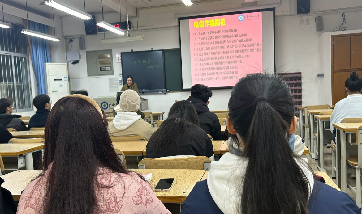 班会上,各班班主任、辅导员发挥思政课关键课程作用,创新教学方式方法,把思政课讲活,讲得通俗易懂、贴近现实生活。此外,各班通过学习警示案例、学习下载智桂通APP、观看视频和防骗手册等形式,加强安全教育、加强防范电信网络诈骗教育、加强网络安全教育,加大对学生“两卡”(手机卡、银行卡)知识的宣传普及力度,提高个人安全防范意识和自我保护能力。