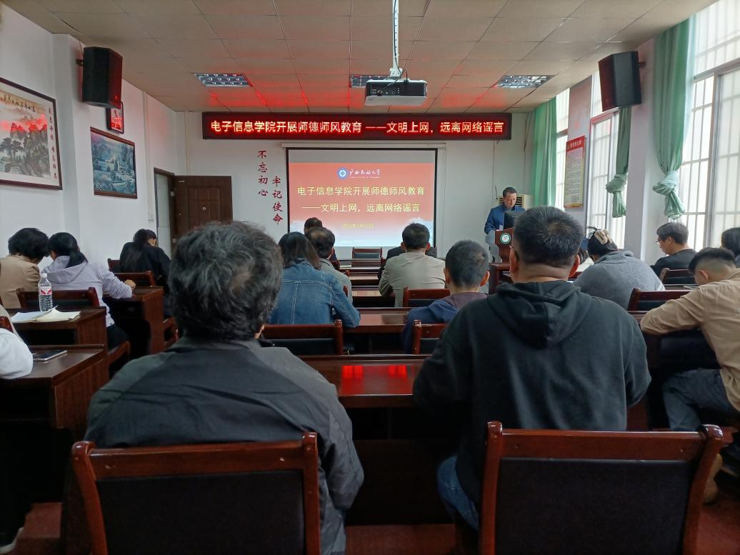 为加强教职工师德教育,营造风清气正网络文化环境,3月12日下午,电子信息学院在215会议室开展“文明上网,远离网络谣言”专题警示教育,学院党委副书记、院长罗丽平,党委副书记、纪委书记罗少科,副院长文春明、卢振坤,学院全体教职工参会。会议由罗少科主持。