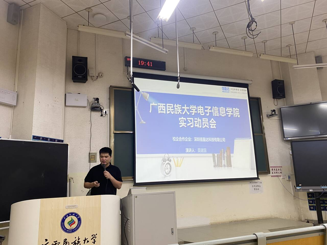 6月13日晚,电子信息学院在学友楼301召开深圳信盈达科技有限公司集中实习宣讲会,深圳信盈达科技有限公司南宁分公司渠道经理莫建国主讲,2021级各班学生参会。会议由辅导员邱银强主持。
