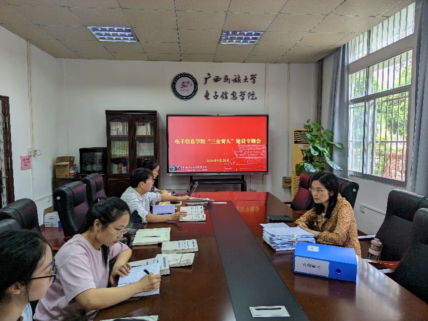 为落实立德树人根本任务,持续推进全区“三全育人”综合改革示范院系建设提质增效,9月25日上午,电子信息学院在博识楼218会议室召开“三全育人”综合改革示范院系建设阶段总结暨工作推进会。学院党委书记张婧及学院“三全育人”工作各小组成员参会。