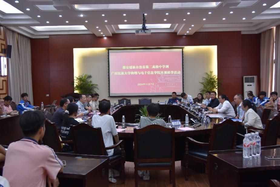 本次交流会由罗少科主持,莫晓华、韦峻峰、马伏花、肖尧、陈娇等教师代表以及都安二高副校长陈茂双老师等一行参加。会上,罗少科首先对都安二高师生代表的到来表示了热烈的欢迎,随后,罗少科向都安二高的师生们介绍了学校的办学理念、发展特色、专业设置、招生政策以及学院的发展情况并鼓励同学们积极报考广西民族大学。紧接着,莫晓华就人才培养、毕业生实习等有关问题同都安二高的老师们进行深入交流。最后,2022级电子信息工程人才卓越实验班的黄肖肖、2024级物理学1班的唐秀强和2024级物理学2班的蓝红强作为就读于我院的都安籍学生代表同同学们进行大学生活的交流分享并对同学们的疑问进行解答,交流会现场气氛热烈。