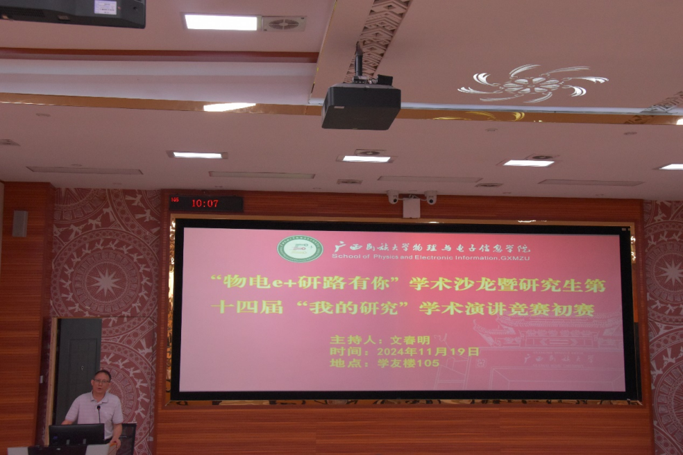 为促进优秀科研成果的交流分享,助力研究生拓展学术视野,11 月 19 日上午,我院于学友楼 105 室隆重举办“物电 e+研路有你”学术沙龙暨研究生第十四届“我的研究”学术演讲竞赛初赛。本次活动由副院长文春明主持,学院全体研究生参加。