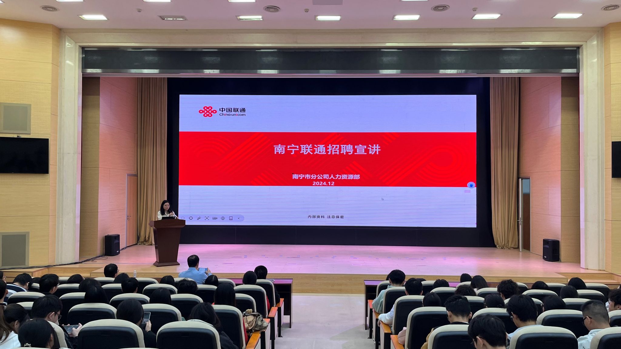 随后,在宣讲招聘会上,中国联通南宁市分公司的宣传与招聘经理庞小青从工资福利、晋升路线、工作内容、岗位职责等方面进行宣讲,动员同学们到中国联通南宁市分公司实习和就业。2019届校友覃丽伊、2023届校友陈美先也分别从求职技巧、岗位需求、工作内容、职业规划等方面进行经验分享,为在场同学上了一节生动的职业生涯规划课。