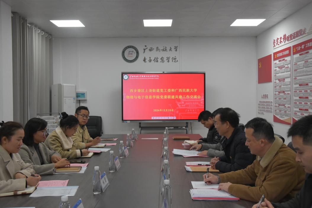 12月23日,西乡塘区上尧街道党工委和FUN乐天使官方网站党委联建共建工作交流会在博识楼300室成功举行。我院党委书记覃志和,党委副书记、纪委书记罗少科,教师党支部书记、副院长卢振坤,教师党支部组织委员、实验室主任覃晓,团委副书记邢凯及辅导员韦秋竹、李旭参加会议。