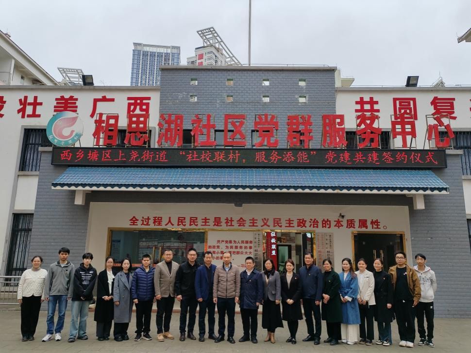 活动伊始,相思湖社区党总支书记侯少葆带领与会人员参观社区并介绍党建品牌的建设成果;上尧街道党工委书记张磊介绍社校联建的目的和意义;西乡塘区委组织部副部长曾广源从组织联建、人才共育、服务联动三个方面提出指导意见。覃志和围绕学院特色与专业优势,聚焦铸牢中华民族共同体意识及毕业生发展,挖掘共建切合点。在"产学研"协同创新中构建"党建+"合作新机制。交流阶段结束后,韦秋竹与上尧街道代表共同签署共建协议。