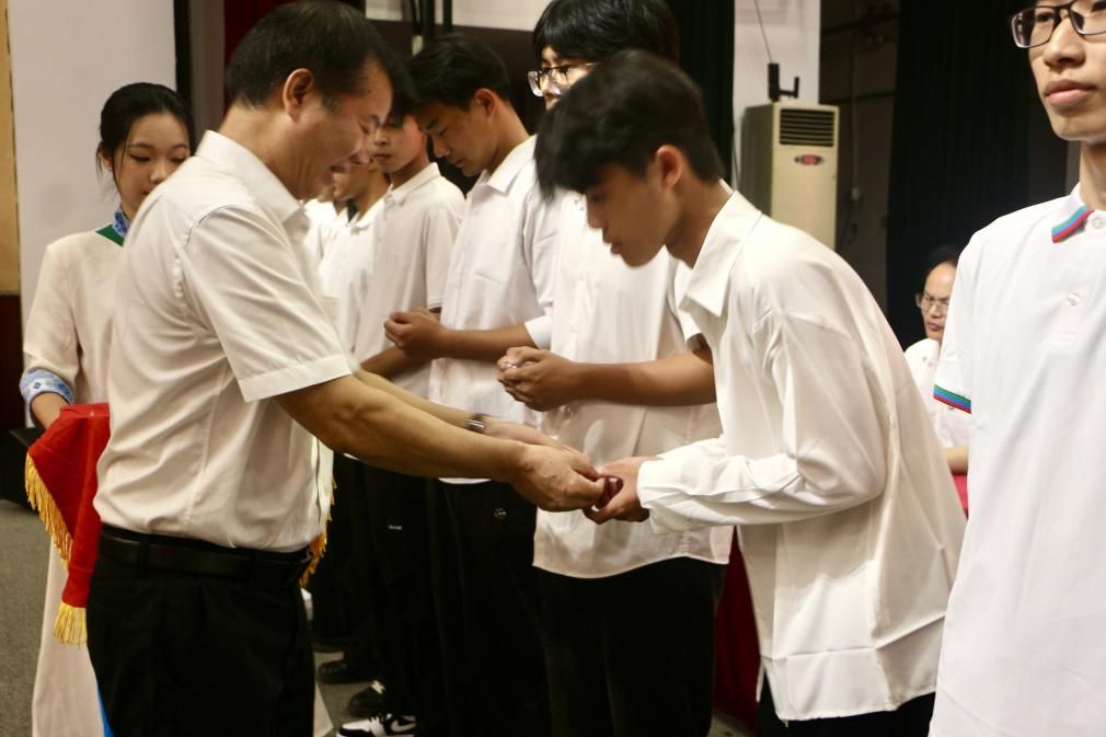 典礼上,学院党委书记覃志和为新生代表授予院徽。2025级新生代表们齐将院徽徽章佩戴在胸前,带着自豪感和责任感,成为勇担使命的新物电人。